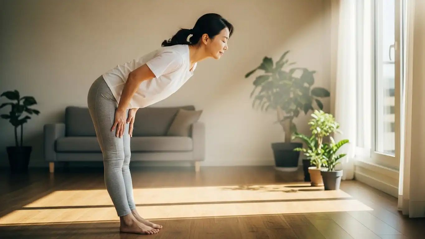 허벅지 뒤 근육(햄스트링)이 뻣뻣하면 허리가 더 당겨집니다. 의자에 앉아 한쪽 다리를 쭉 뻗고 상체를 앞으로 천천히 숙여보세요. 이 동작은 신경 긴장을 완화시켜 협착증 통증을 줄여줍니다.