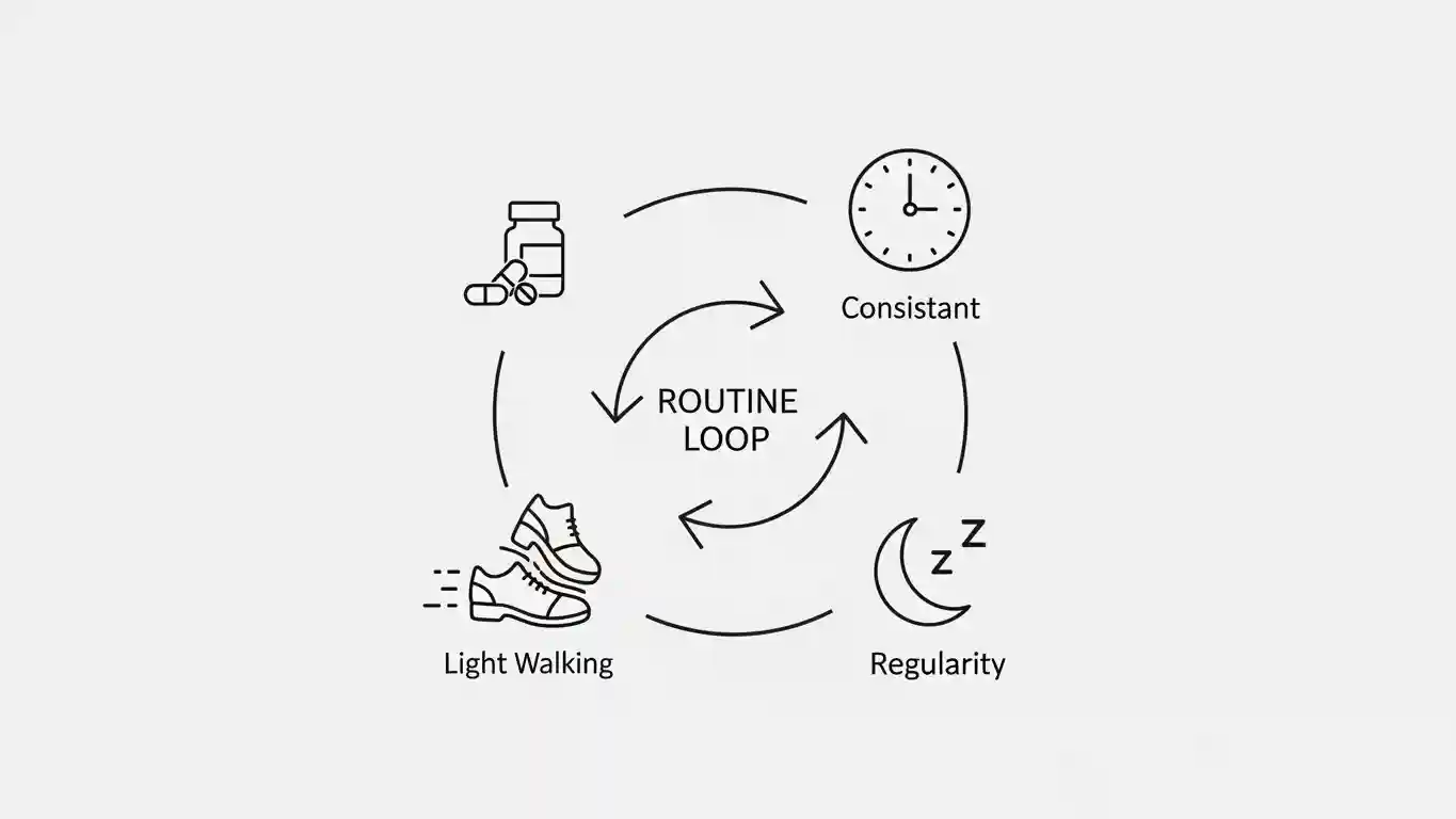 • “다당체만”으로 해결되지는 않습니다. 가장 효율적인 조합은 “시간 고정 복용 + 수면 고정 + 가벼운 걷기”입니다.