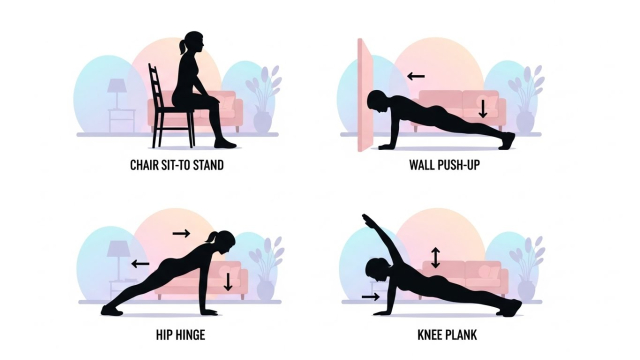 • 2분: 벽 스쿼트(무릎 부담 줄이기) 또는 의자 앉았다 일어나기