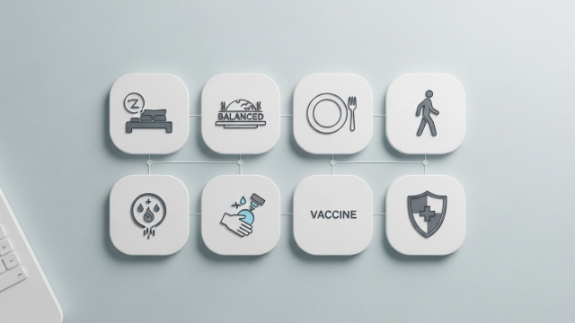 • 핵심은 6가지입니다: 수면, 단백질·채소 중심 식사, 걷기, 스트레스 관리, 위생, 예방접종.