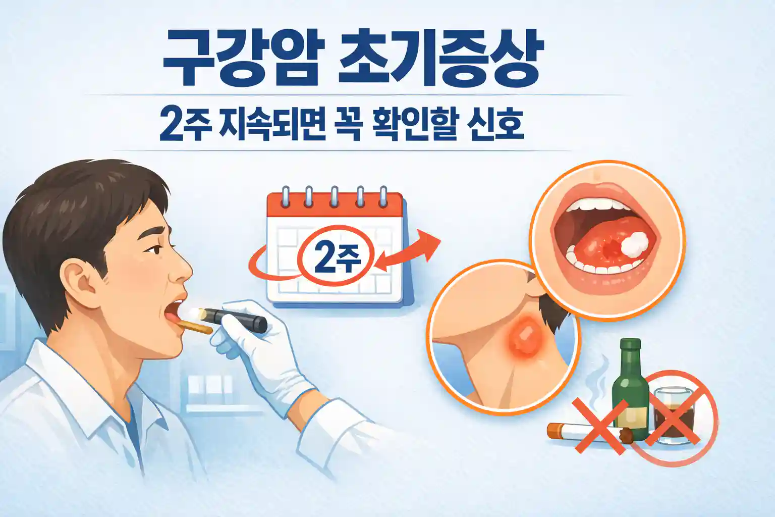 구강암 초기증상은 ① 2주 이상 낫지 않는 상처 + ② 흰/붉은 반점 + ③ 덩어리·두꺼워짐이 핵심입니다. 특히 흡연·음주·HPV·의치(틀니) 마찰이 겹치면 “그냥 두기”보다 검사로 확인이 안전합니다.
